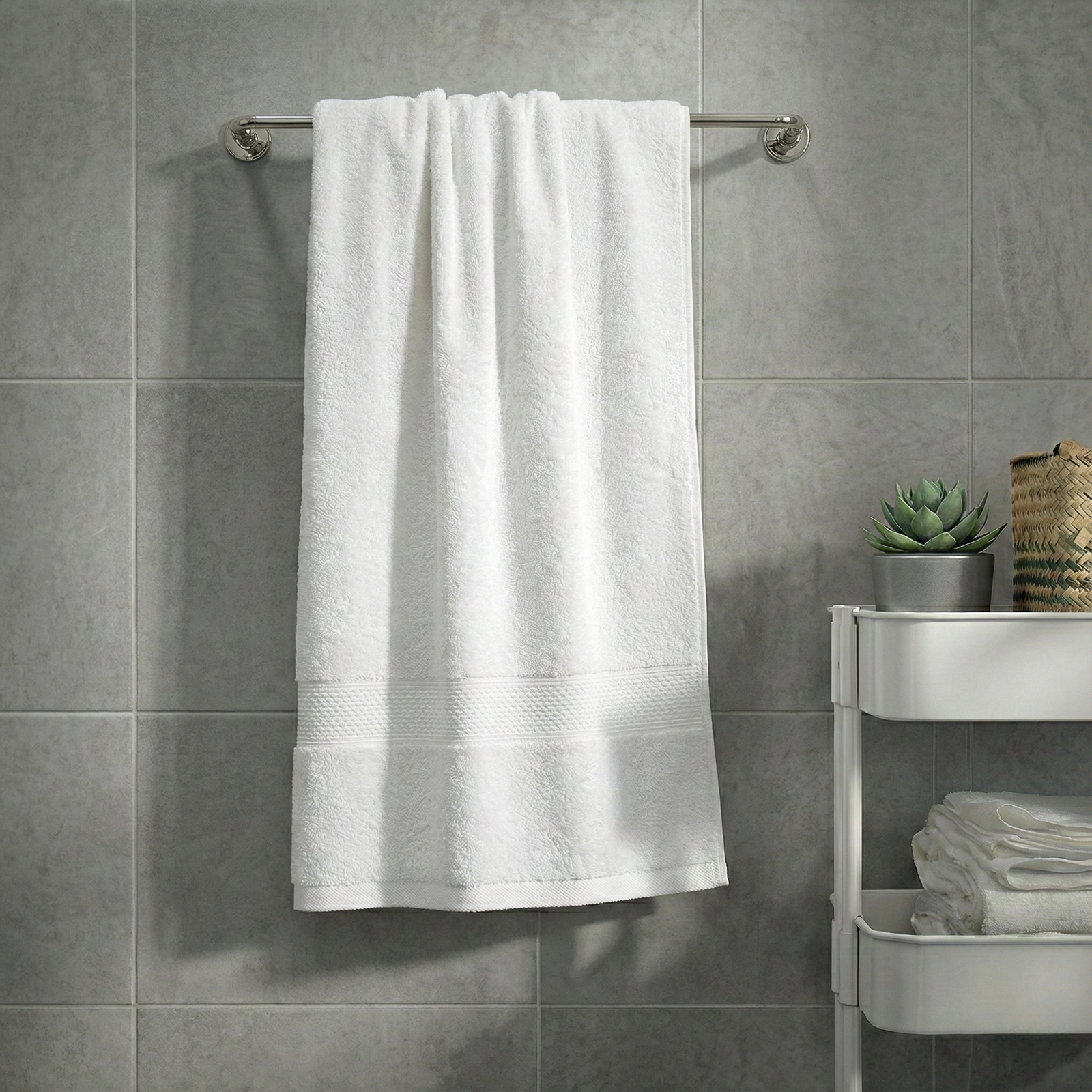 Experience luxury and comfort with this White Bath Towel. Measuring 70×140 cm, it is crafted from 100% cotton with 16s yarn and a plush 600 GSM weight for superior softness and absorbency. The elegant dobby border adds a touch of sophistication, making it a perfect addition to any bathroom décor. Durable and long-lasting, this towel provides a spa-like feel for daily use at home or in hotels.