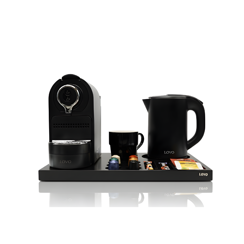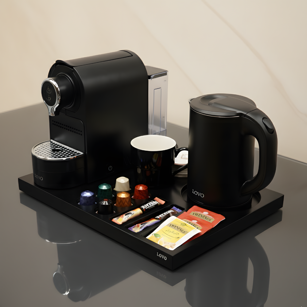 Durable Tray Design: Comes with a black melamine tray (42 × 31.5 × 2.5 cm) to keep the setup neat and elegant in guest rooms.