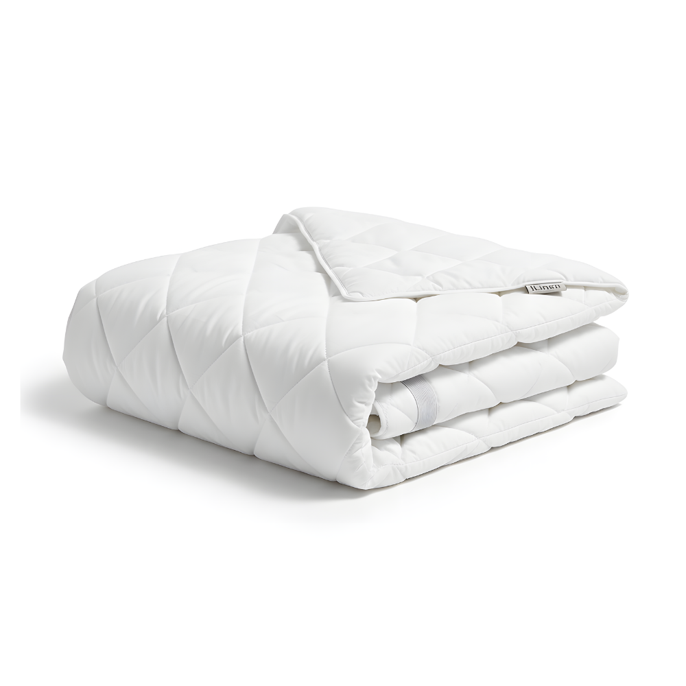 This King size mattress protector is 180×200 cm and designed to fit large beds comfortably. Made from 180TC 100% cotton, it feels soft, cool, and airy throughout the night. The 150gsm polyfibre filling provides gentle comfort while protecting the mattress. Elastic belts at the corners ensure it stays in place. The white color and iLinen quality make it ideal for hotel or home use.