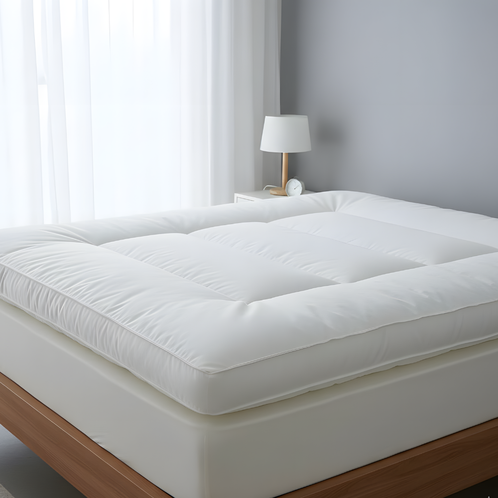 This Super King mattress topper is 200x200x8 cm and offers full coverage for large beds. It is made from 233TC 100% cotton down proof fabric in a fresh white color. The 800gsm microfiber filling adds exceptional softness and plush cushioning for extra comfort. It improves the overall feel of the mattress and provides a cozy, hotel quality sleep. With its neat design and premium materials, it gives the bed a luxurious and inviting look.